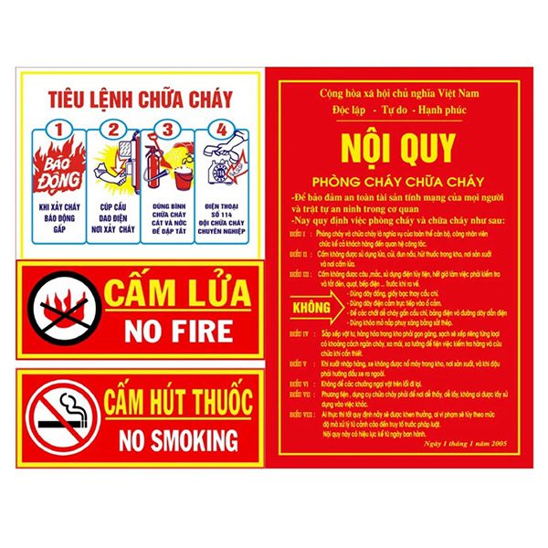 Xuất xứ : Việt Nam Bộ nội quy, tiêu lệnh phòng cháy chữa cháy :  Là những danh mục liệt kê ra những quy định về việc đảm bảo an toàn phòng chống cháy nổ, trong đó hướng dẫn chi tiết nhất những bước hành động và công tác phải làm khi hỏa hoạn xảy ra. Chất liệu: Tôn ko gỉ Cấu tạo :Mẫu bộ nội quy tiêu lệnh gồm 04 tấm: Nội quy phòng cháy Tiêu lệnh chữa cháy Bảng cấm hút thuốc Bảng cấm lửa KÍCH THƯỚC CHUẨN BỘ NỘI QUY TIÊU LỆNH PHÒNG CHÁY CHỮA CHÁY : – Tiêu lệnh chữa cháy: 32(cm) x 44(cm) – –  Cấm lửa: 18(cm) x 40(cm)